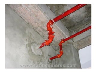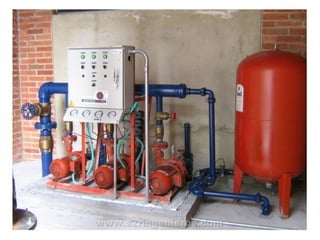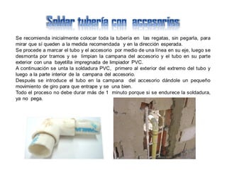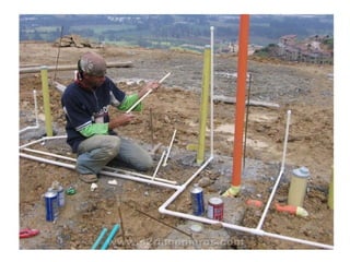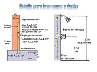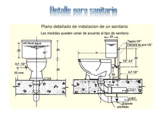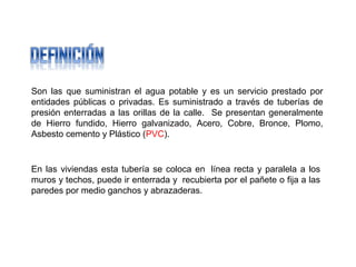 El documento describe los componentes básicos de una red de distribución de agua dentro de una vivienda, incluyendo las tuberías, accesorios y herramientas necesarias para la instalación. Explica que la tubería se coloca generalmente de PVC de 1/2 pulgadas enterrada en las paredes o pegada con abrazaderas, y señala la importancia de incluir prolongaciones en las salidas de lavamanos y sanitarios para evitar golpes de ariete.