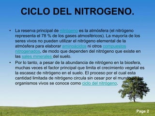 El documento describe la importancia del nitrógeno y el fósforo para el crecimiento de las plantas, destacando que el nitrógeno es esencial para la síntesis de proteínas y clorofila, mientras que el fósforo es crucial para funciones metabólicas y energéticas. Se detalla el ciclo del nitrógeno, las deficiencias que afectan a los cultivos y la necesidad de fertilización para mejorar el rendimiento. Además, se menciona cómo ambos elementos son limitantes en el crecimiento vegetal debido a su disponibilidad en el suelo y la influencia del calcio y la materia orgánica en su absorción.