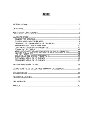 Este documento presenta las características físicas y de comparación de las cuencas de los ríos Amayo y Chanseñora en El Salvador. Describe conceptos básicos de cuencas hidrológicas y sus características como área, orden de corrientes, densidad de corrientes, pendiente del cauce principal y clasificación de corrientes. Luego resume las características específicas de estas cuencas como su forma, índice de compacidad, factor forma, sinuosidad, elevación media y pendiente media.