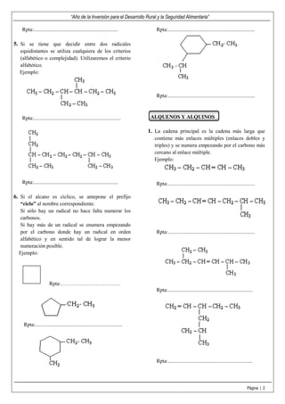 Este documento presenta las reglas para la nomenclatura sistemática de hidrocarburos como alcanos, alquenos y alquinos. Explica que para los alcanos la cadena principal se enumera empezando por el carbono más cercano a un radical y el nombre termina en "ano". Para alquenos y alquinos, la cadena principal se enumera empezando por el carbono más cercano a un enlace múltiple, y se indica la posición de los enlaces dobles y triples. También cubre nomenclatura de cicloalquenos y compuestos