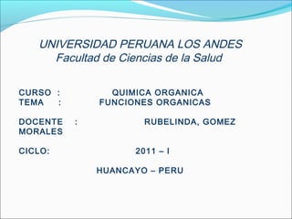 Este documento proporciona información sobre las funciones orgánicas más importantes, incluyendo hidrocarburos, haluros de alquilo, alcoholes, éteres, aminas, aldehídos y cetonas. Describe las estructuras químicas básicas de cada función, así como sus nomenclaturas y propiedades distintivas. El documento también incluye diagramas para ilustrar las densidades electrónicas de varias moléculas representativas.