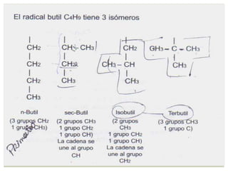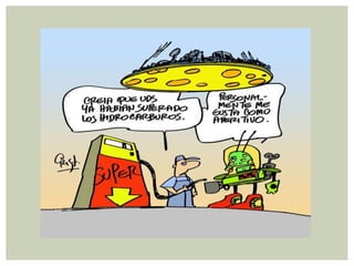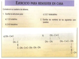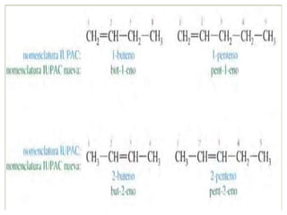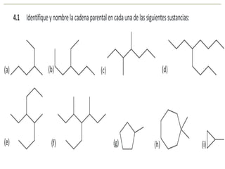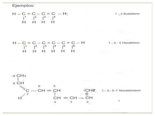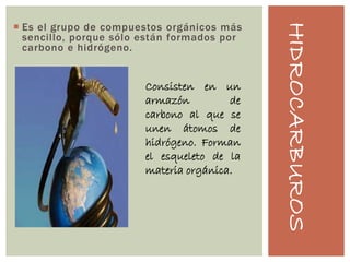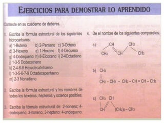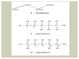Este documento proporciona información sobre los hidrocarburos. Los hidrocarburos son compuestos orgánicos formados solo por carbono e hidrógeno. Incluye alcanos, alquenos y alquinos. Los alcanos son hidrocarburos saturados cuya fórmula general es CnH2n+2. Los alquenos contienen uno o más enlaces dobles C=C y tienen la fórmula CnH2n. Los alquinos tienen un triple enlace C≡C y fórmula CnH2n-2.