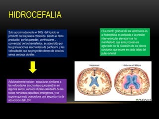 La hidrocefalia es una acumulación anormal de líquido cefalorraquídeo dentro de los ventrículos cerebrales. Puede ser causada por una obstrucción en el flujo del líquido o por problemas en su absorción. Existen tres tipos principales: obstructiva, comunicante y pasiva. Los síntomas dependen de la edad del paciente y pueden incluir un aumento rápido de la circunferencia de la cabeza, vómitos, letargo y problemas visuales. El diagnóstico se realiza mediante ecografía, TAC o