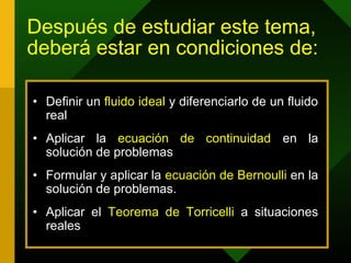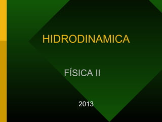 Este documento trata sobre hidrodinámica y contiene información sobre fluidos en movimiento, ecuaciones como la de continuidad, Bernoulli y Torricelli, y aplicaciones como medidores de caudal como el tubo Venturi y tubo de Pitot. Explica conceptos clave como línea de corriente, tubo de corriente, viscosidad y tipos de flujo. También incluye un ejemplo de cálculo sobre la presión, altura y potencia de un chorro de agua saliendo de una tubería.