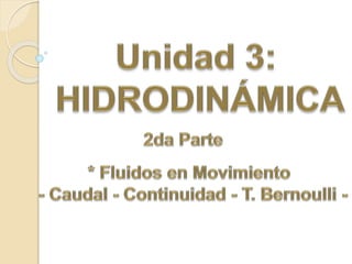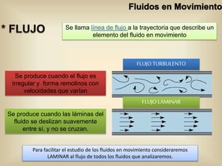 Este documento describe los diferentes tipos de flujo de fluidos, laminar y turbulento. Explica que el flujo laminar ocurre cuando las capas de fluido se deslizan suavemente sin mezclarse, mientras que el flujo turbulento es irregular con remolinos. También presenta la ecuación para calcular el número de Reynolds y determinar qué régimen existe dependiendo de su valor.