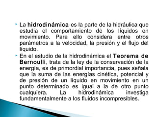 1) La hidrodinámica estudia el comportamiento de los líquidos en movimiento considerando parámetros como la velocidad, presión y flujo.