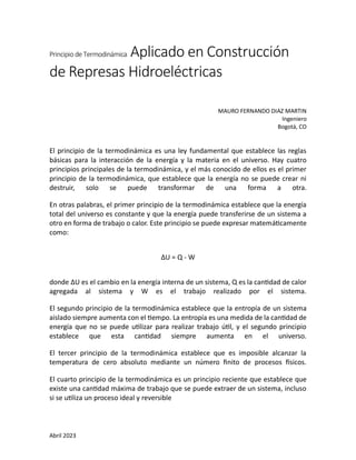 El primer principio de la termodinámica establece que la energía no se puede crear ni destruir, solo se puede transformar de una forma a otra. Este principio es importante en la construcción de represas hidroeléctricas porque permite transformar la energía potencial del agua almacenada en la represa en energía eléctrica a través de las turbinas. La viscosidad del agua y la presión hidrostática sobre las paredes de la represa aumentan con la profundidad y deben considerarse en el diseño para garantizar un flujo estable y eficiente