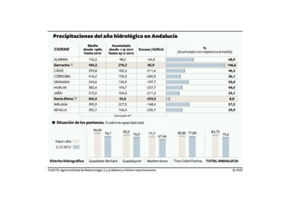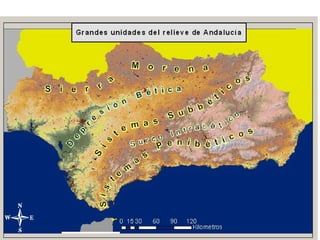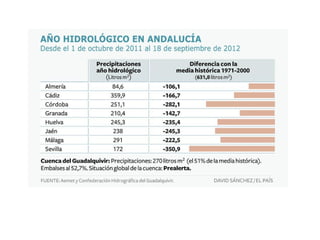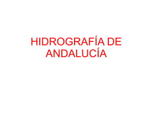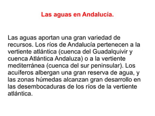 Este documento describe la hidrografía de Andalucía. Los ríos pertenecen a la vertiente atlántica o mediterránea. Los principales ríos son el Guadalquivir y el Guadalete en la vertiente atlántica, y el Guadiaro y Guadalhorce en la mediterránea. También hay importantes embalses como el Tranco de Beas e Iznájar, y marismas como las del Odiel y Tinto. El documento también analiza problemas como la sobreexplotación de recursos hídricos y la