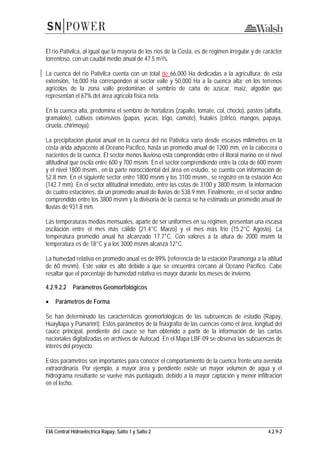El documento describe la hidrología de la cuenca del río Pativilca en Perú, incluida la subcuenca del río Rapay. El río Pativilca nace en la Cordillera de los Andes a más de 5,000 msnm y desemboca en el Océano Pacífico después de recorrer 164 km. Se han identificado varios proyectos hidroeléctricos potenciales a lo largo del río Pativilca y sus afluentes. La subcuenca del río Rapay tiene las mejores características topográficas