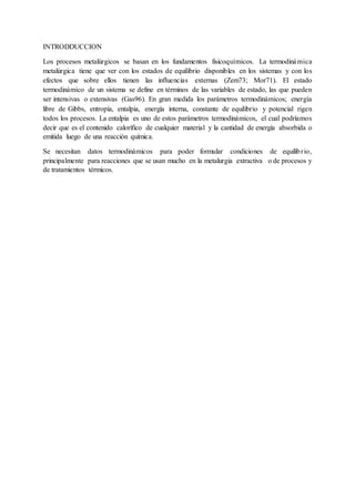 La hidrometalurgia se basa en procesos termodinámicos y cinéticos para extraer metales de minerales a través de medios acuosos. Estos procesos incluyen la lixiviación endotérmica de sólidos, la purificación y concentración de metales disueltos, y la precipitación para recuperar los valores metálicos. Aunque la termodinámica evalúa la posibilidad de las reacciones, la cinética es más importante en hidrometalurgia debido a las bajas temperaturas involuc