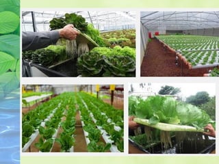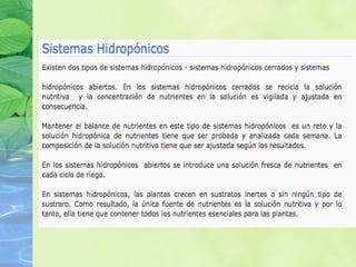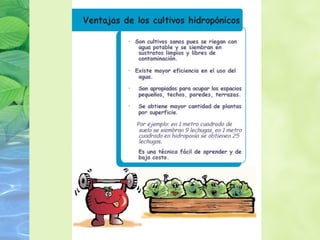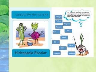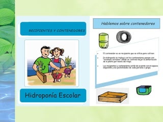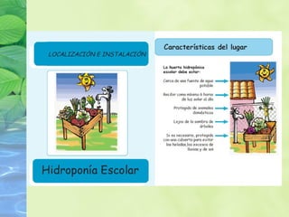 Este documento describe un huerto hidropónico escolar y proporciona un enlace a un sistema hidropónico casero barato. El autor visitó este huerto que ha crecido mucho y recomienda ver su sitio web para obtener más información sobre lo que hacen.