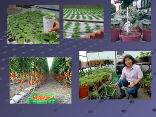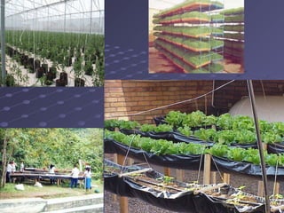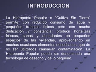 Este documento presenta los principios básicos de la hidroponía. Explica que la hidroponía permite cultivar hortalizas de forma sana y abundante usando poco espacio y agua. Describe los tres tipos de sistemas hidropónicos (en medio líquido, sustrato sólido inerte y aeroponía), los componentes clave (recipientes, nutrientes, sustrato, plantas), y varias fórmulas y valores óptimos para soluciones nutritivas. El objetivo general es mostrar cómo la hidroponía puede ser una alternativa