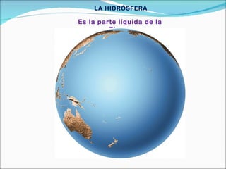 Este documento proporciona información sobre la hidrosfera, que es la parte líquida de la Tierra. Explica que la hidrosfera está compuesta principalmente por mares y océanos, que comprenden el 97.2% del agua en la Tierra. También incluye agua dulce en lagos y ríos, que representan solo el 2.8% restante. Describe brevemente los cinco océanos principales y algunos de los lagos y ríos más grandes del mundo.