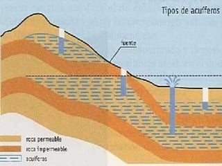 Este documento describe los componentes principales de la hidrosfera de la Tierra. El agua salada ocupa el 71% de la superficie terrestre y se encuentra en los océanos Pacífico, Atlántico, Índico, Ártico y Antártico. El agua dulce, que representa solo el 3% del agua total, se almacena en ríos, lagos, glaciares y acuíferos subterráneos. Los ríos transportan el agua desde las zonas altas hasta los mares, y los lagos se