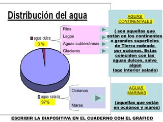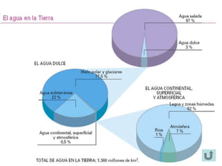 La hidrosfera comprende todas las aguas en la Tierra, incluyendo océanos, ríos, lagos y aguas subterráneas, y se clasifica en aguas continentales y marinas. El ciclo del agua incluye las fases de evaporación, condensación, precipitación y escorrentía, manteniendo la distribución de agua constante. Además, se describen las características de ríos, humedales, glaciares y los movimientos del agua, como corrientes marinas y mareas.
