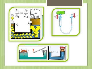 Este documento resume el Teorema de Pascal y el Principio de Arquímedes. Explica que según el Teorema de Pascal, la presión en un fluido incompresible es constante en todas las direcciones, y que según el Principio de Arquímedes, un cuerpo sumergido en un fluido experimenta una fuerza ascendente igual al peso del fluido desplazado. También describe cómo funciona una prensa hidráulica utilizando el Teorema de Pascal para amplificar fuerzas aplicando menor fuerza sobre un émbolo más grande.