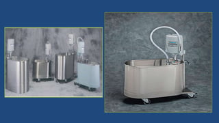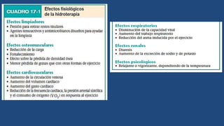 La hidroterapia es la aplicación del agua para tratar disfunciones físicas y psicológicas, destacando sus propiedades físicas como la flotabilidad y la presión hidrostática. Sus efectos fisiológicos incluyen beneficios en la limpieza de heridas, mejora cardiovascular, respiratoria y renal, y efectos psicológicos que dependen de la temperatura del agua. La hidroterapia puede ser utilizada con diferentes técnicas y equipos, como el tanque de Hubbard y el tanque de whirlpool, y tiene contraindicaciones y precauciones específicas que deben considerarse.