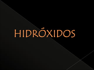 Los hidróxidos son compuestos formados por la unión de un óxido básico con agua, que contienen el grupo OH-. Se nombran como hidróxido seguido del nombre del metal, y su fórmula general es M(OH)x. El documento presenta ejemplos de la formación de hidróxidos metálicos a través de reacciones químicas y su nomenclatura clásica, de Stock y sistemática.