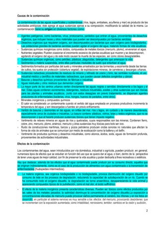 La contaminación del agua es un problema ambiental importante que afecta la salud humana y los ecosistemas. Los contaminantes del agua incluyen agentes patógenos, desechos orgánicos, sustancias químicas y sedimentos procedentes de actividades humanas como la agricultura, la industria y la falta de tratamiento de aguas residuales. Esto causa efectos como enfermedades, muerte de organismos acuáticos y eutrofización. Se necesitan más inversiones para mejorar el acceso a agua potable y sistemas de