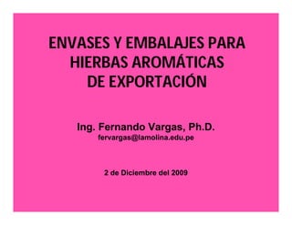 Este documento trata sobre los envases y embalajes adecuados para hierbas aromáticas de exportación. Explica que las hierbas aromáticas pueden presentarse frescas, secas o procesadas, y cada forma requiere un envase diferente. También discute los materiales de envase apropiados para cada presentación, incluyendo plástico, vidrio y hojalata. Además, recomienda el uso de absorbedores de oxígeno, controladores de humedad y antimicrobianos para preservar las propiedades de las hierbas durante el al