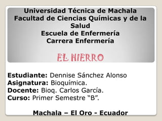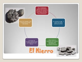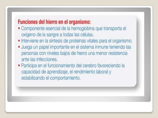 El documento presenta información sobre el hierro, incluyendo su número atómico, abundancia en la corteza terrestre, características como su color gris plateado y propiedades magnéticas, y su papel vital pero en pequeñas cantidades en los seres vivos para el transporte de oxígeno y metabolismo celular. También describe las dos formas químicas de hierro en los alimentos, hemo y no hemo, y los factores que afectan la absorción del hierro.