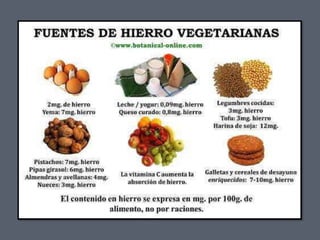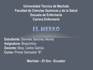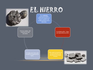 El documento presenta información sobre el hierro como elemento químico. Explica que es el cuarto elemento más abundante en la corteza terrestre, es ferromagnético a temperatura ambiente, y se encuentra en el núcleo de la Tierra. Además, detalla que aunque solo existe en pequeñas cantidades en los seres vivos, cumple un papel vital en procesos como el transporte de oxígeno y la respiración celular. Finalmente, comenta que la deficiencia de hierro es el desorden nutricional más común en el