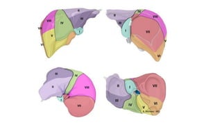 El documento describe la anatomía del hígado y las vías biliares. El hígado es la glándula más grande del aparato digestivo y pesa aproximadamente 1,400-1,500 gramos. Está dividido en dos lóbulos, derecho e izquierdo, separados por el ligamento falciforme. El hígado recibe sangre de la vena porta hepática y drena la bilis a través de los conductos biliares hacia el conducto hepático común y el colédoco. Existe una segmentación funcional del hígado en