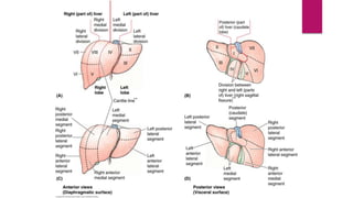 El hígado es una glándula localizada en el abdomen superior derecho que regula los niveles de glucosa en la sangre y secreta bilis. Tiene forma semiovoide y está dividido en dos lóbulos. Cumple funciones importantes como almacenar glucógeno y secretar bilis para ayudar a digerir los alimentos.