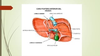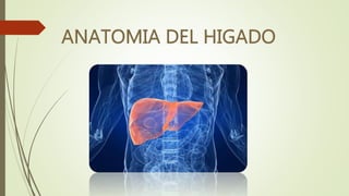 El documento describe la anatomía del hígado y el páncreas. El hígado es la glándula más grande del cuerpo situada debajo del diafragma. Tiene dos lóbulos principales y múltiples funciones como la producción de bilis y regulación de sustancias en la sangre. El páncreas es una glándula anexa al duodeno que secreta enzimas digestivas a través de conductos al intestino delgado y hormonas como la insulina a la sangre.