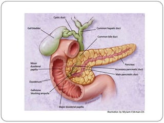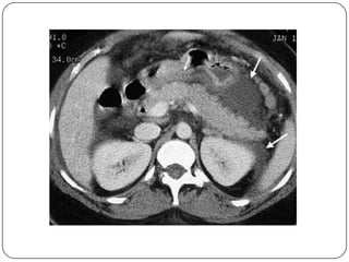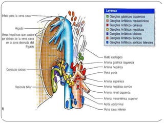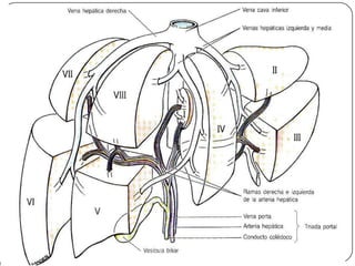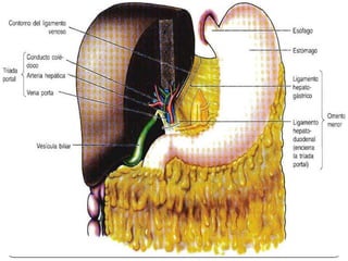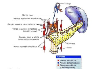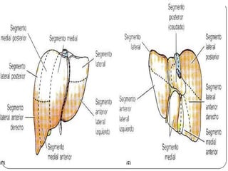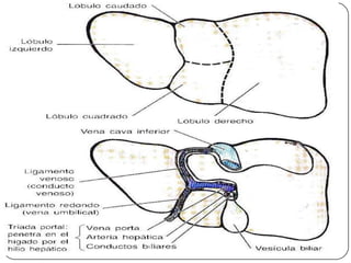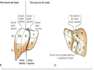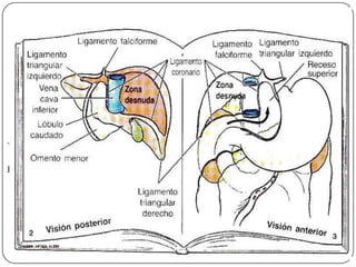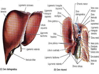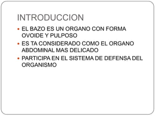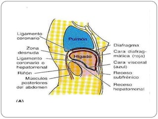 Este documento describe la anatomía del bazo, páncreas e hígado. Explica la localización, funciones, relaciones y vascularización de cada órgano. El bazo se sitúa en la región abdominal izquierda y participa en el sistema inmune. El páncreas está localizado en el retroperitoneo y combina funciones exocrinas e endocrinas. El hígado es la glándula más grande y se ubica en la parte superior del abdomen, realizando funciones metabólicas y almacenando bilis.