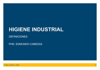 La higiene industrial se define como una técnica dedicada a reconocer, evaluar y controlar los factores ambientales en el lugar de trabajo que pueden ocasionar enfermedades o disminuir la salud de los trabajadores. Se divide en ramas como la higiene teórica, que estudia la relación entre contaminantes y salud; la higiene de campo, que realiza estudios en el ambiente laboral; y la higiene analítica y operativa, que miden y controlan los contaminantes respectivamente.