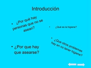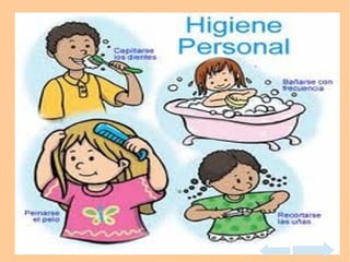 El documento habla sobre la importancia de la higiene personal. Explica que la higiene es el cuidado corporal que produce satisfacción propia y de los demás debido al olor que desprendemos. También menciona que las personas con mayor higiene corporal son más afectivas y deseadas. Finalmente, enfatiza que es necesario asearse para tener una buena presentación ante otros y evitar problemas de salud como mal aliento u otros problemas causados por falta de higiene.