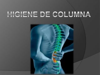 La higiene postural es importante para mantener una columna sana. Las posiciones como la bipedestación y la sedestación tienen diferentes demandas fisiológicas. Al trabajar, descansar, conducir o dormir se deben adoptar posturas correctas para evitar sobrecargar la columna o causar lesiones.