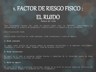 Este documento describe varios factores de riesgo físico como el ruido, las temperaturas extremas, la ventilación, la iluminación y la presión. Explica los diferentes tipos de ruido y sus fuentes principales, así como los efectos de las temperaturas altas y bajas en la salud humana. También describe la importancia de una buena ventilación y iluminación en el lugar de trabajo y los factores a considerar para lograrlo. Finalmente, menciona brevemente la radiación como factor de riesgo físico.