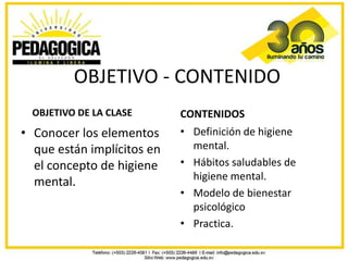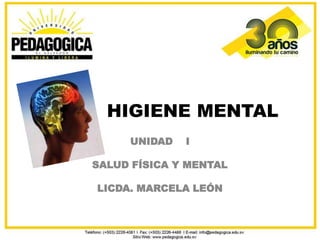 El documento aborda la higiene mental y su relación con la salud física y mental, definiendo la higiene mental como un conjunto de actividades que permiten el equilibrio del individuo con su entorno sociocultural. Se presentan hábitos saludables como la gestión de emociones, la valoración positiva de uno mismo y de los demás, y el balance diario para promover el bienestar psicológico. Además, describe un modelo de bienestar que incluye áreas vitales como el control, la espiritualidad y la amistad como componentes clave para una funcionalidad sana.
