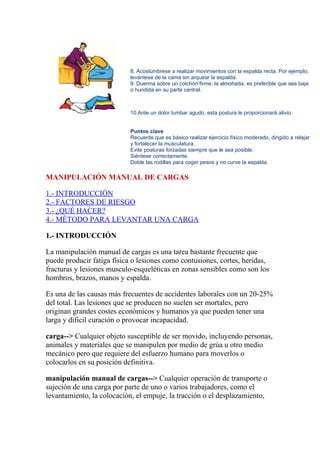 Este documento proporciona información sobre la higiene postural y la manipulación manual de cargas para prevenir lesiones. Detalla normas de higiene postural como mantener una buena postura al sentarse y levantar objetos, y recomienda ejercicio físico moderado. También describe factores de riesgo y recomendaciones para la manipulación de cargas, incluyendo no levantar cargas superiores a 25 kg, mantener la espalda recta y usar agarres cómodos.
