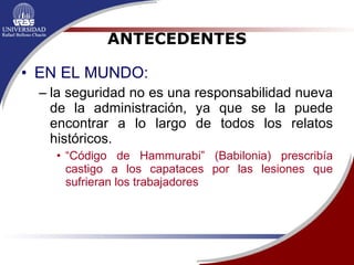 El documento describe los antecedentes históricos de la higiene y seguridad industrial desde la antigüedad hasta la actualidad. Comienza con las primeras leyes de protección a trabajadores en Babilonia y continúa explicando el desarrollo del tema a través de la revolución industrial, las encíclicas papales y las primeras leyes y organizaciones dedicadas a la seguridad laboral en Europa y América. Finalmente, detalla los orígenes de las políticas de seguridad e higiene en Venezuela desde la época colonial hasta la creación del mar