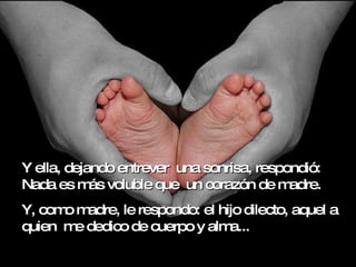 La madre responde que no tiene un hijo preferido, sino que ama a todos por igual aunque en diferentes momentos y circunstancias. Explica que ama al hijo enfermo hasta que sane, al que se fue hasta que regrese, y así sucesivamente por cada situación que puedan enfrentar. El documento también analiza cómo las relaciones entre padres e hijos han cambiado, con los padres siendo más permisivos pero también más débiles e inseguros, y los hijos siendo más poderosos. Finalmente, argumenta que se necesita un enfoque fir