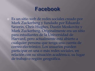Facebook es un sitio de redes sociales creado por Mark Zuckerberg y sus compañeros de Harvard originalmente para estudiantes pero ahora abierto a todos, que permite a los usuarios comunicarse y compartir contenido con otras personas en sus redes, como amigos, compañeros de trabajo o de la misma región.
