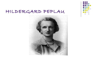 Hildegarde Peplau desarrolló la teoría de las relaciones interpersonales, la cual se centra en la relación enfermero-paciente. La teoría propone 4 fases en la relación: orientación, identificación, explotación y resolución. Peplau también describe 6 funciones que la enfermera debe desarrollar: extraño, persona-recurso, docente, conductor, sustituto y consejero. El objetivo es ayudar al paciente a alcanzar la salud a través de una relación de cooperación entre enfermero y paciente