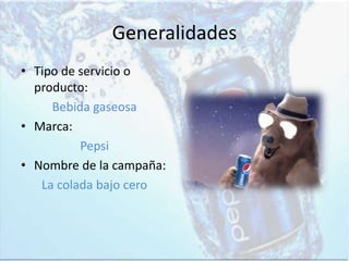 La campaña publicitaria de Pepsi "La colada bajo cero" busca posicionar a la marca como refrescante y motivadora. Su objetivo es llegar a jóvenes y adultos en redes sociales y páginas web, prometiendo que Pepsi los refrescará en momentos de felicidad como ver partidos de fútbol mundial. El análisis del mensaje indica que Pepsi ayudará a los espectadores a relajarse y vivir cada momento con alegría y emoción, especialmente en estadios durante la Copa del Mundo en
