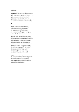 El himno del SENA insta a los estudiantes a luchar por Colombia con amor y nobleza para transformarla en un mundo mejor. Exhorta a los jóvenes a aprovechar el trabajo y la educación técnica que ofrece el SENA para forjar el futuro y progreso del país a través de la ciencia, la técnica y la paz. Finalmente, pide a los estudiantes avanzar con fuerza y tesón para llevar a cabo la revolución pacífica que la patria espera de ellos.