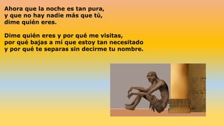 El poema expresa la necesidad del hablante de conocer la identidad de una figura misteriosa que visita durante la noche. El hablante le pide repetidamente que revele quién es y por qué lo visita, ya que su presencia trae consuelo a su tristeza existencial. Finalmente, el hablante le ruega que lo sostenga entre sus manos para aliviar su pena.