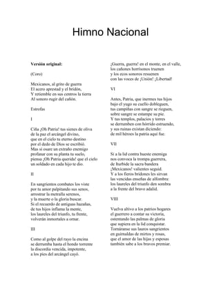 El himno nacional de México exhorta a los mexicanos a defender su patria de enemigos externos y luchar por su libertad e independencia. Hace referencia a la historia de héroes y batallas mexicanos y promete gloria eterna para aquellos que den su vida por México. Finalmente, jura lealtad a la patria y promete exhalar el último aliento luchando con valor cuando suene la llamada a la guerra.