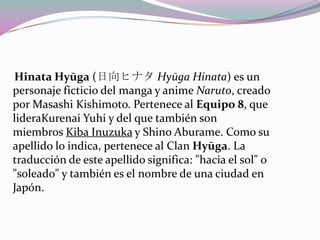 Este documento resume la historia y personalidad del personaje Hinata Hyuga del anime/manga Naruto. Pertenece al Equipo 8 liderado por Kurenai Yuhi. Proviene del clan Hyuga y fue entrenada en artes marciales suaves desde los 3 años. A pesar de su habilidad, su padre la consideró una "causa perdida" por su timidez y falta de confianza. Más adelante mejora gracias al apoyo de Naruto, de quien está enamorada.