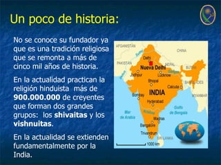 El hinduismo es una religión politeísta originada en la India hace más de 5000 años, sin un fundador conocido. Sus principales dioses son Brahma, creador y regulador del karma; Vishnú, mantenedor del cosmos; y Shiva, transformador. Los hindúes buscan fundir su alma (atman) con lo divino (brahmán) a través de la reencarnación y el cumplimiento del deber según su casta y etapas de vida, determinados por las leyes del karma y el dharma.