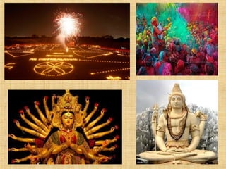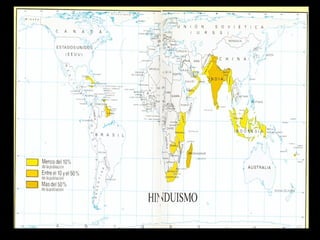 Este documento resume las principales creencias, prácticas y costumbres del hinduismo. Explica que el hinduismo se practica principalmente en la India, Nepal y Mauricio. No tiene un fundador ni doctrina única, sino que es una tradición compuesta por varias religiones. Algunas de sus creencias clave son la reencarnación, el karma, y la adoración a dioses como Brahma, Vishnu, Shiva y Krishna. También describe importantes símbolos, textos sagrados, festividades y lugares sagrados como los templos hindúes.
