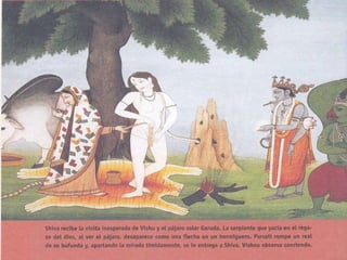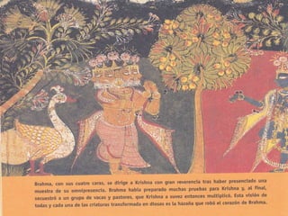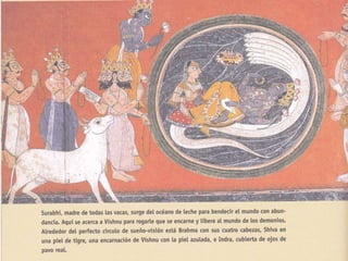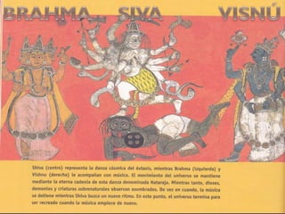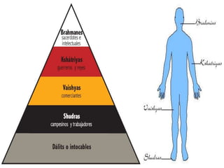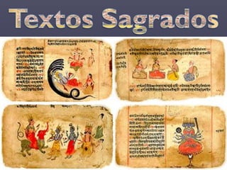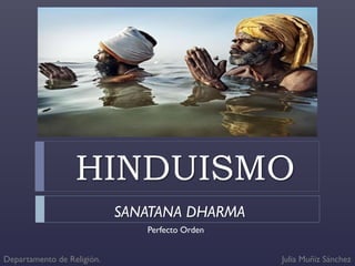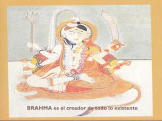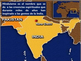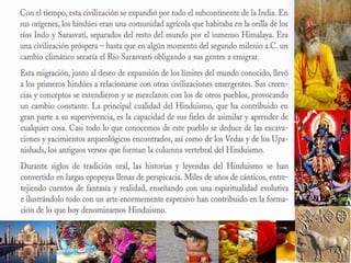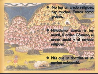 El hinduismo es una religión originada en la India hace más de 5,000 años a partir de la mezcla de creencias de diferentes pueblos. No tiene un único fundador sino que se basa en textos sagrados como los Vedas y Upanisadas. Enseña la reencarnación guiada por la ley del karma y que a través de los avatares es posible alcanzar la unión con Brahman. Divide a la sociedad en castas hereditarias y enseña el culto a dioses como Brahma, Visnú y Siva a través de rituales, mantras