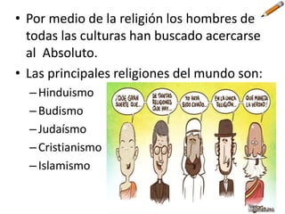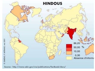 El documento resume las características principales del hinduismo, la religión originada en el valle del río Indo hacia el 3000 a.C. y que carece de un fundador único. Los elementos clave incluyen los Vedas como libros sagrados, la creencia en el ciclo de reencarnaciones y la búsqueda de la liberación, y la veneración de dioses como Brahma, Visnú y Shiva. Celebra festividades como Diwali y Holi en sus templos, dirigidos por sacerdotes brahmanes.