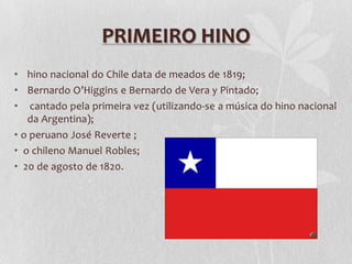 El documento resume la historia del himno nacional de Chile. Comenzó como un himno provisional en 1819 con letra de Bernardo de Vera y Pintado y música tomada del himno argentino. En 1828 se adoptó una versión definitiva con música compuesta por Ramón Carnicer y letra de Vera. Esta versión se mantuvo hasta 1850 cuando se encargó una nueva versión a Eusebio Lillo que conservó la música pero cambió parte de la letra.